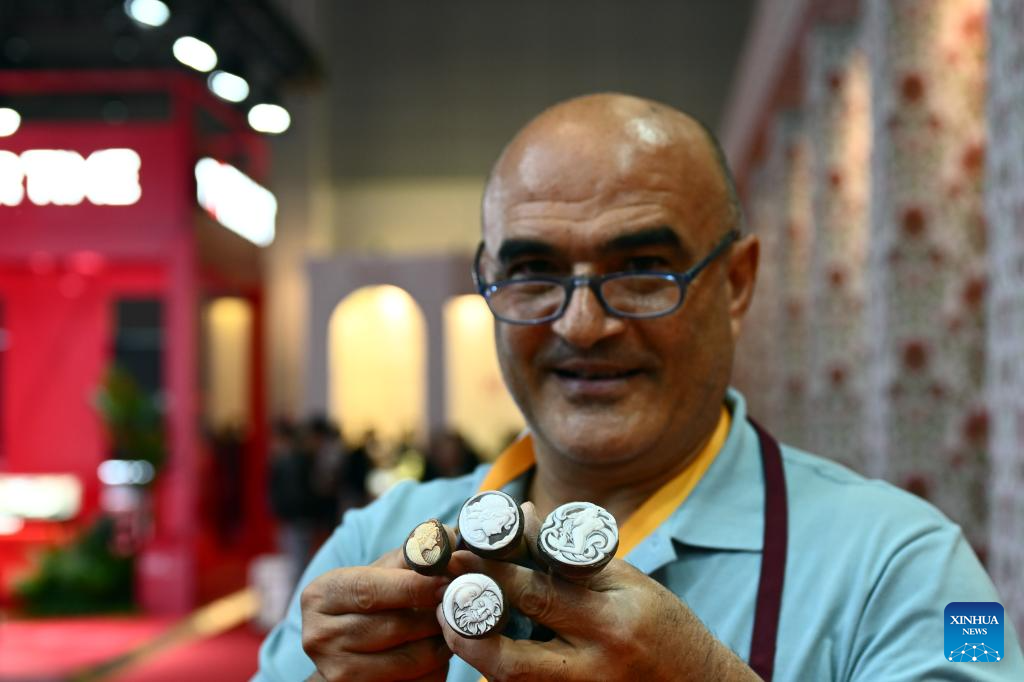 Ciro Esposito shows his shell cameo works at the 6th China International Import Expo (CIIE) in east China's Shanghai, Nov. 6, 2023. Ciro Esposito, nearly 60 years old, was born in a carving family. He has studied the use of carving tools since 7 years old and became famous in Italian market and beyond. It is the third time Esposito has participated in the expo. (Xinhua/Jin Liangkuai)