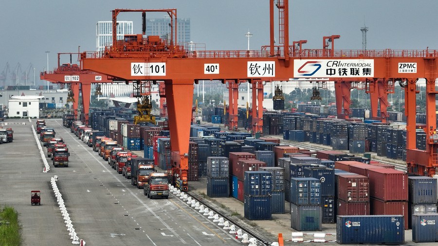 This aerial photo taken on Oct. 26, 2023 shows trucks transporting containers at a railway freight yard in Qinzhou City, south China's Guangxi Zhuang Autonomous Region. (Xinhua/Zhang Ailin)
