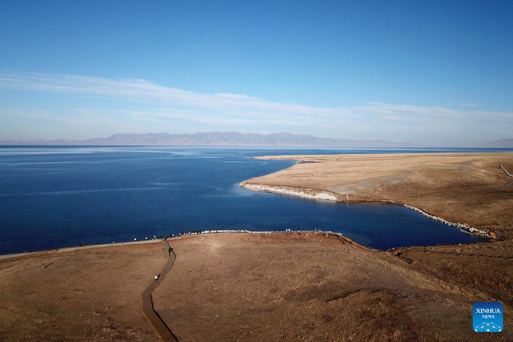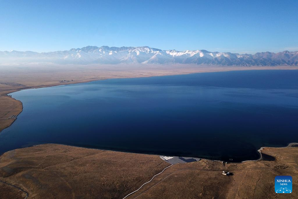 This aerial photo taken on Nov. 6, 2023 shows a view of Sayram Lake in Bortala Mongolian Autonomous Prefecture, northwest China's Xinjiang Uygur Autonomous Region. Sayram Lake is the largest and highest alpine lake in Xinjiang. (Xinhua/Li Xin)