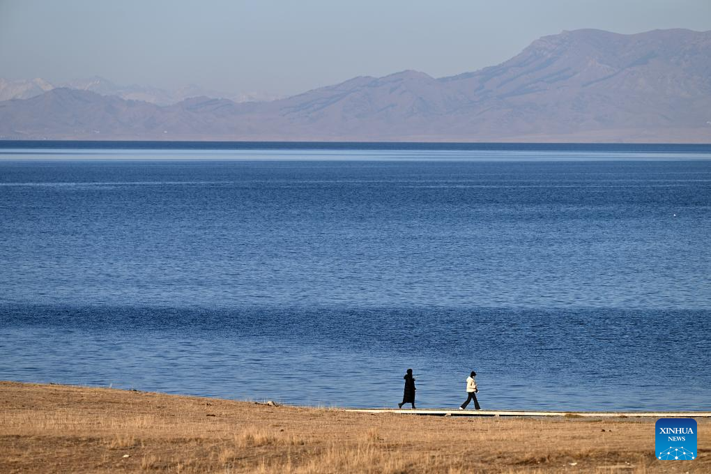 Tourists visit Sayram Lake in Bortala Mongolian Autonomous Prefecture, northwest China's Xinjiang Uygur Autonomous Region, Nov. 6, 2023. Sayram Lake is the largest and highest alpine lake in Xinjiang. (Xinhua/Li Xin)