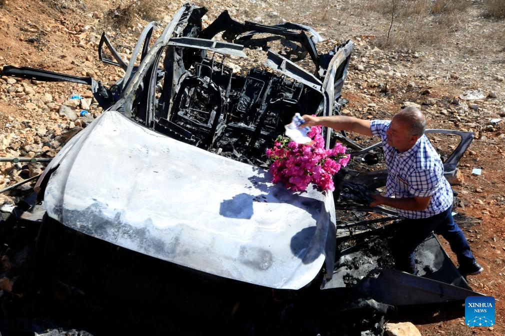 A relative of victims places flowers on a car that was bombed by an Israeli drone in Ainatha, Lebanon, Nov. 6, 2023. (Photo by Ali Hashisho/Xinhua)