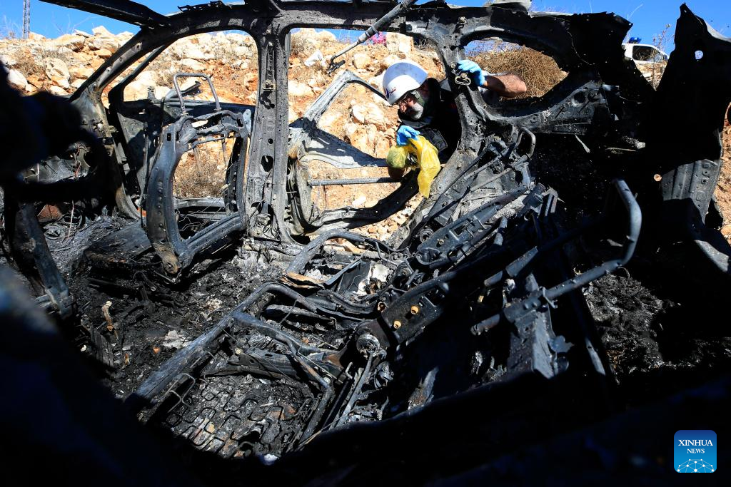 A paramedic checks on the wreckage of a car that was bombed by an Israeli drone in south Lebanon's Ainatha, Nov. 6, 2023. (Photo by Ali Hashisho/Xinhua)