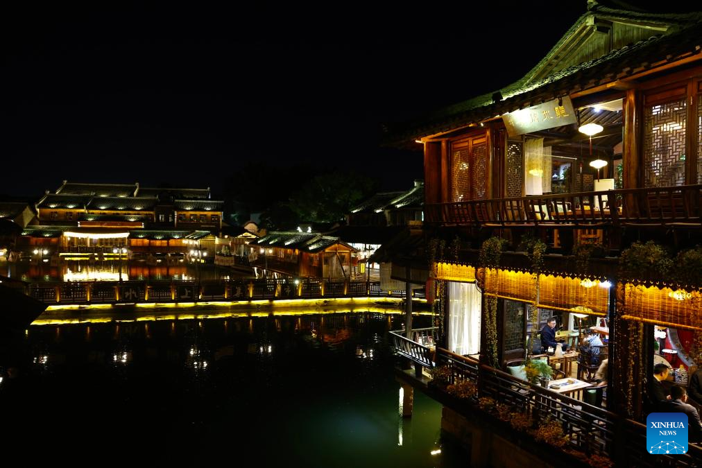 This photo taken on Nov. 7, 2023 shows a night view of river town Wuzhen, east China's Zhejiang Province. (Xinhua/Huang Zongzhi)