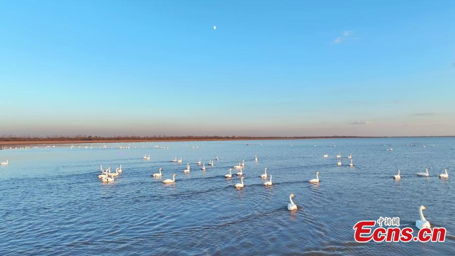 A flock of migratory birds swim in the lake of Hongjiannao National Nature Reserve in Shenmu, northwest China's Shaanxi Province. (Photo: China News Service/Liu Jiangang)