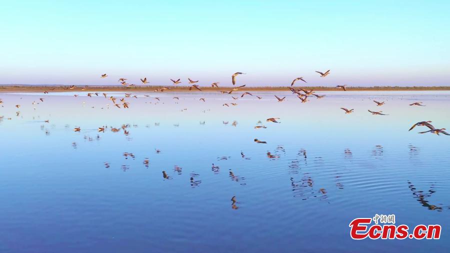 A flock of migratory birds fly over the lake of Hongjiannao National Nature Reserve in Shenmu, northwest China's Shaanxi Province. (Photo: China News Service/Liu Jiangang)