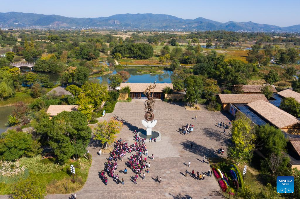 This aerial photo taken on Nov. 7, 2023 shows the entrance of the Archaeological Ruins of Liangzhu City park in Hangzhou, capital city of east China's Zhejiang Province.?(Xinhua/Xu Yu)