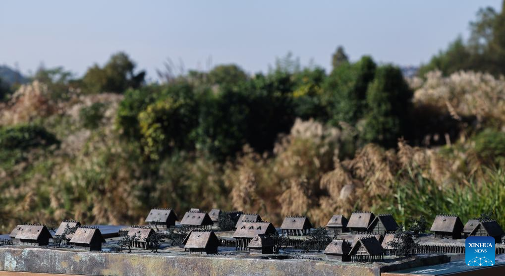 This photo taken on Nov. 7, 2023 shows the model of a workshop at the Archaeological Ruins of Liangzhu City park in Hangzhou, capital city of east China's Zhejiang Province.?(Xinhua/Xu Yu)