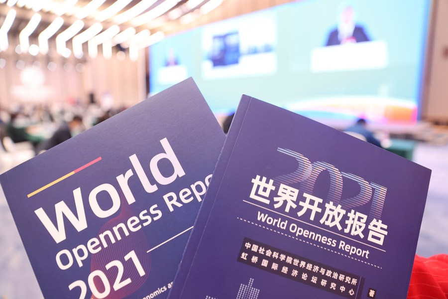 Photo taken on Nov. 5, 2021 shows the World Openness Report 2021 released at a press conference during the fourth Hongqiao International Economic Forum in Shanghai, east China. (Xinhua/Zhang Yuwei)