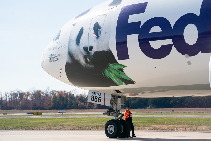 An airplane transporting giant pandas is seen at the Dulles International Airport in Dulles, Virginia, the United States, on Nov. 8, 2023. (Xinhua/Liu Jie)