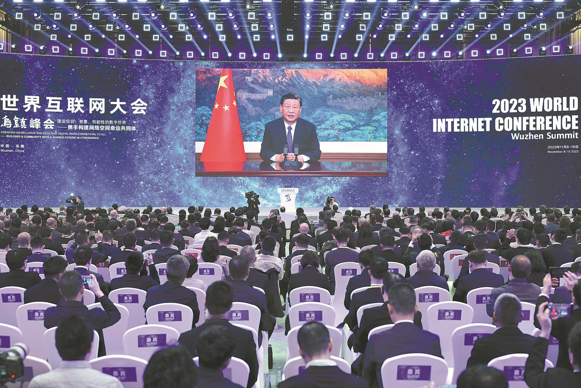 President Xi Jinping addresses the opening ceremony of the 2023 World Internet Conference Wuzhen Summit via video link on Tuesday. The three-day summit has brought together top executives from global tech enterprises and leading Chinese internet companies. [Photo/XINHUA]
