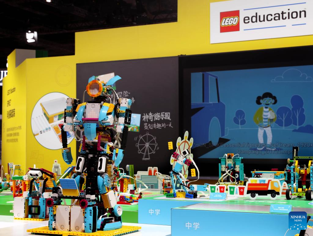 Toy products are displayed at the booth of Danish toy giant LEGO Group during the sixth China International Import Expo (CIIE) in Shanghai, east China, Nov. 6, 2023.?(Xinhua/Zhang Keren)