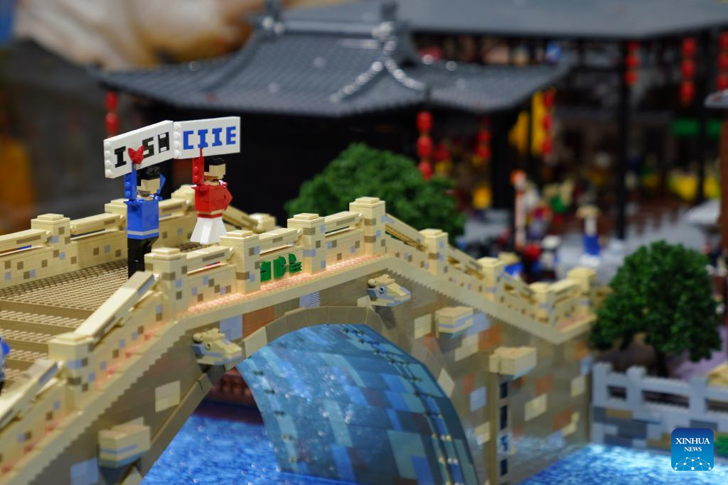 This photo taken on Nov. 7, 2023 shows a model of Fengjing ancient town built with LEGO bricks at the booth of Danish toy giant LEGO Group during the sixth China International Import Expo (CIIE) in Shanghai, east China.?(Xinhua/Li Mengjiao)