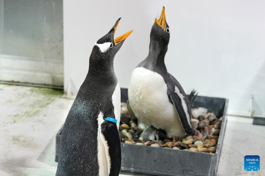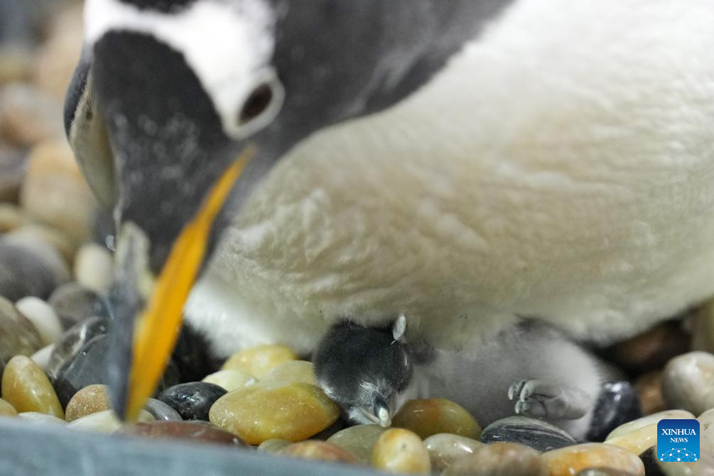 Penguin parents take care of their newborn baby in turn at Harbin Polarland in Harbin, capital of northeast China's Heilongjiang Province, Nov. 8, 2023. (Xinhua/Wang Jianwei)