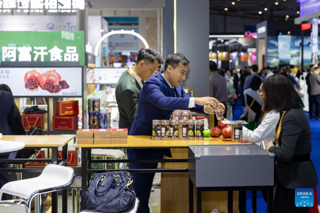 Ali Faiz (C) recommends Afghan food and agricultural products to visitors at the 6th China International Import Expo (CIIE) in east China's Shanghai, Nov. 6, 2023. (Xinhua/Wang Xiang)
