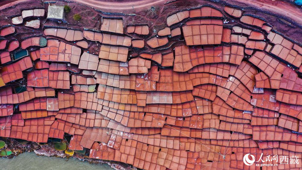 Aerial photo shows the stunning scenery of ancient salt pans in Naxi township, Mangkam county, Qamdo city, southwest China's Xizang Autonomous Region. (People's Daily Online/Tsering Norbu)