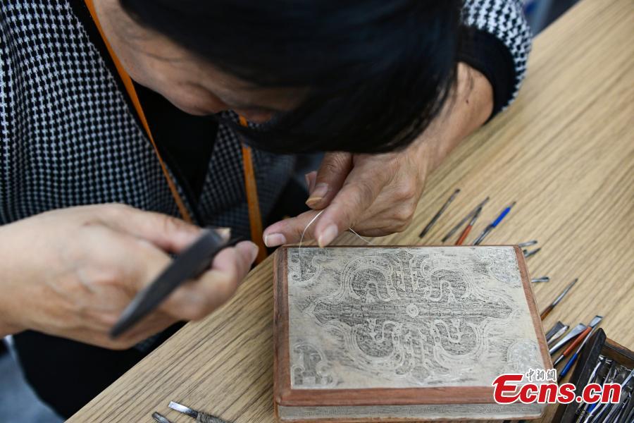An artist works on a redwood inlay silver lacquer ware at the 6th China International Import Expo (CIIE) in Shanghai, Nov. 7, 2023. (Photo: China News Service/Tian Yuhao)