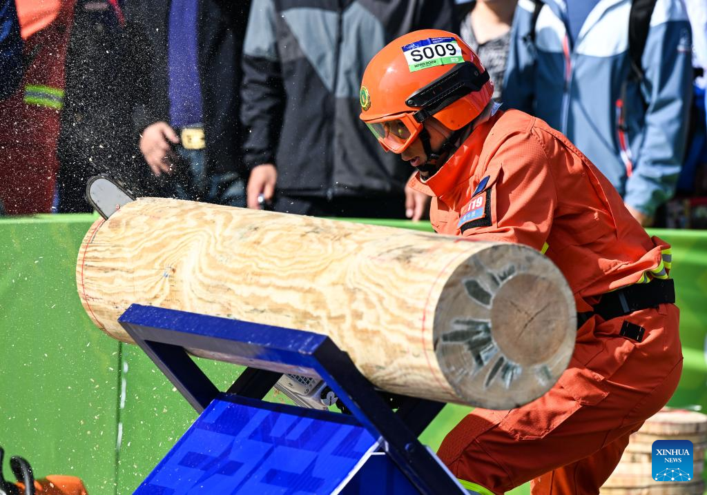 A forest firefighter competes in the national fire and rescue professional skill competition held in Nanjing, east China's Jiangsu Province, Nov. 8, 2023. A total of 343 firefighters from around the country competed in this skill competition on Wednesday. (Xinhua/Ji Chunpeng)