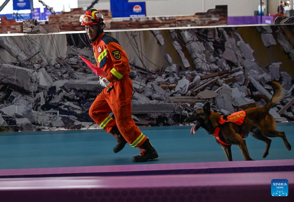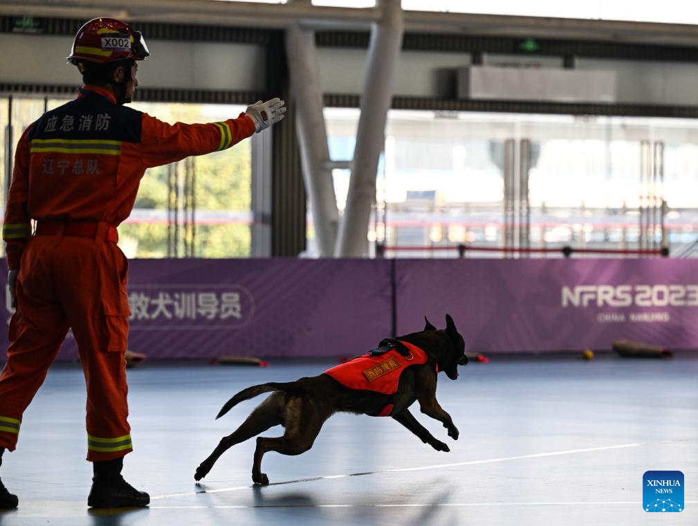 A firefighter and his rescue dog compete in the national fire and rescue professional skill competition held in Nanjing, east China's Jiangsu Province, Nov. 8, 2023. A total of 343 firefighters from around the country competed in this skill competition on Wednesday. (Xinhua/Ji Chunpeng)