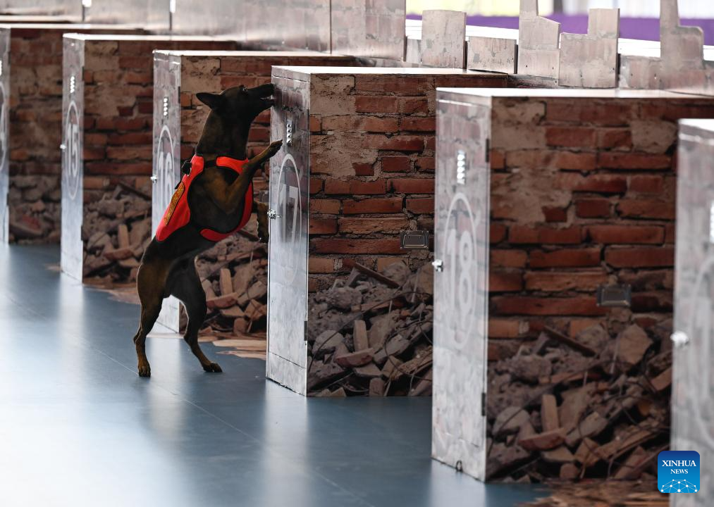 A rescue dog competes in the national fire and rescue professional skill competition held in Nanjing, east China's Jiangsu Province, Nov. 8, 2023. A total of 343 firefighters from around the country competed in this skill competition on Wednesday. (Xinhua/Ji Chunpeng)