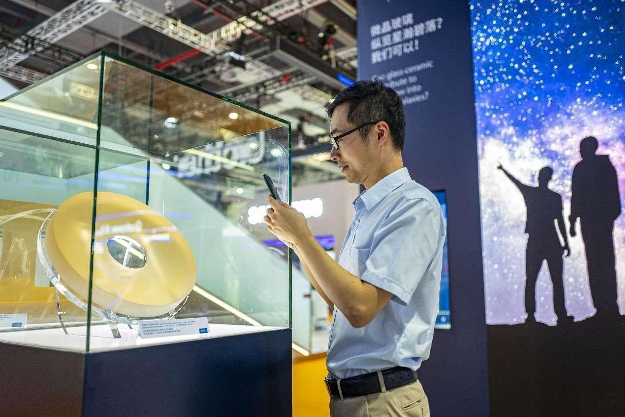 A telescope lens manufactured by German company Schott is debuted at the sixth China International Import Expo, Nov. 5, 2023. (People's Daily Online/Wang Chu)