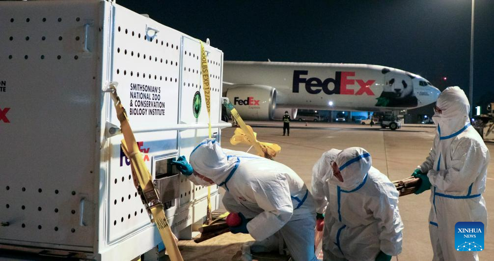 Giant pandas Mei Xiang, Tian Tian and their male cub, Xiao Qi Ji, arrives at the Chengdu Shuangliu International Airport in southwest China's Sichuan Province, Nov. 9, 2023, after wrapping up their stay in the United States. (Photo by Li Chuanyou/Xinhua)