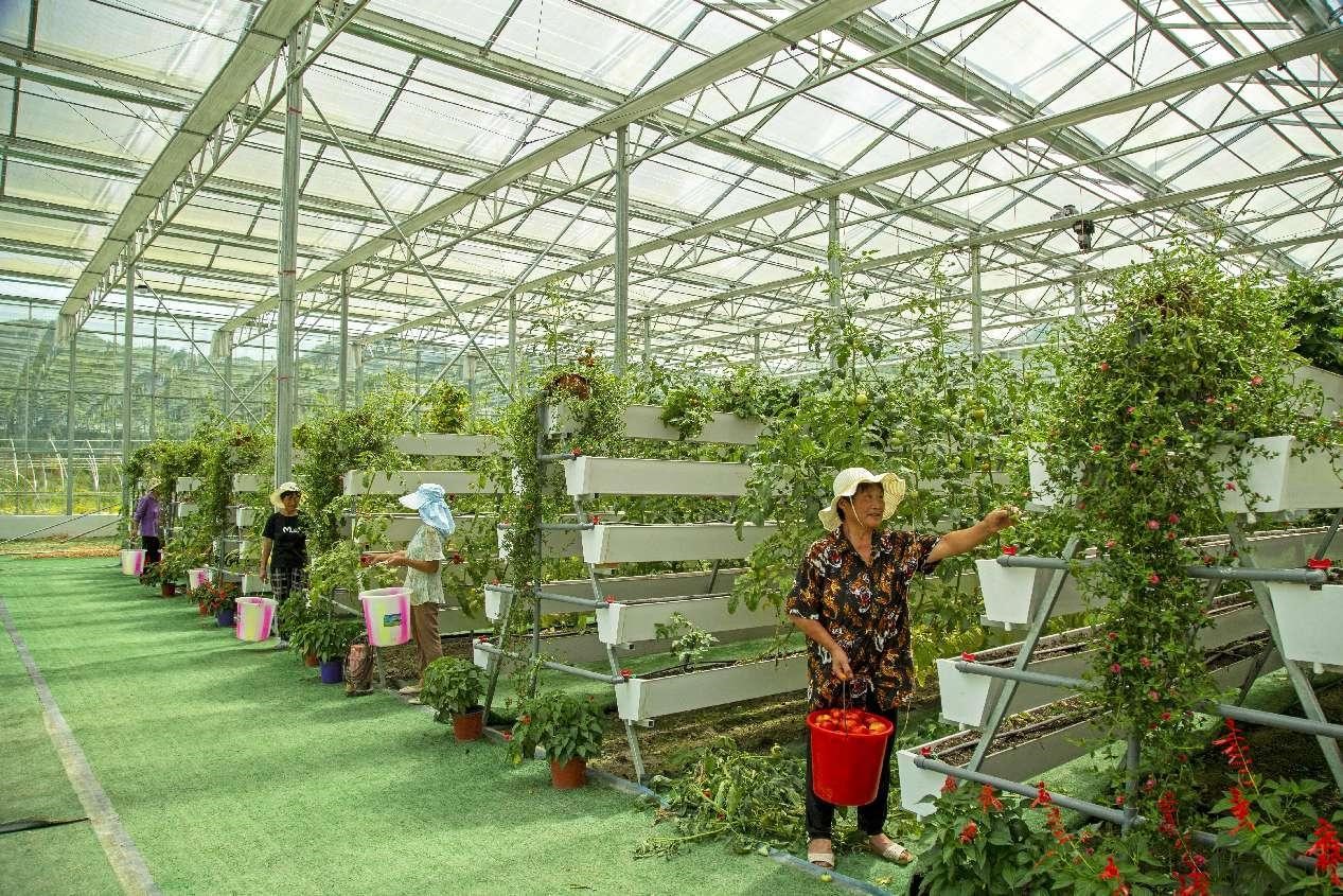 Vegetables and fruits are picked in an intelligent greenhouse in a modern agriculture base in Jizidu village, Enshi, central China's Hubei province. (People's Daily Online/Tan Hua)