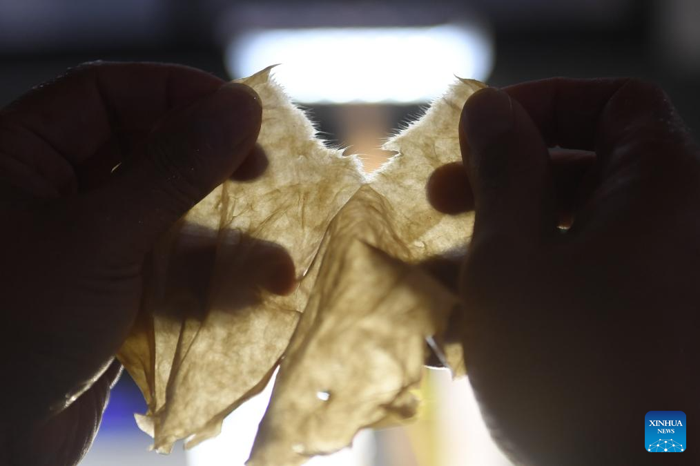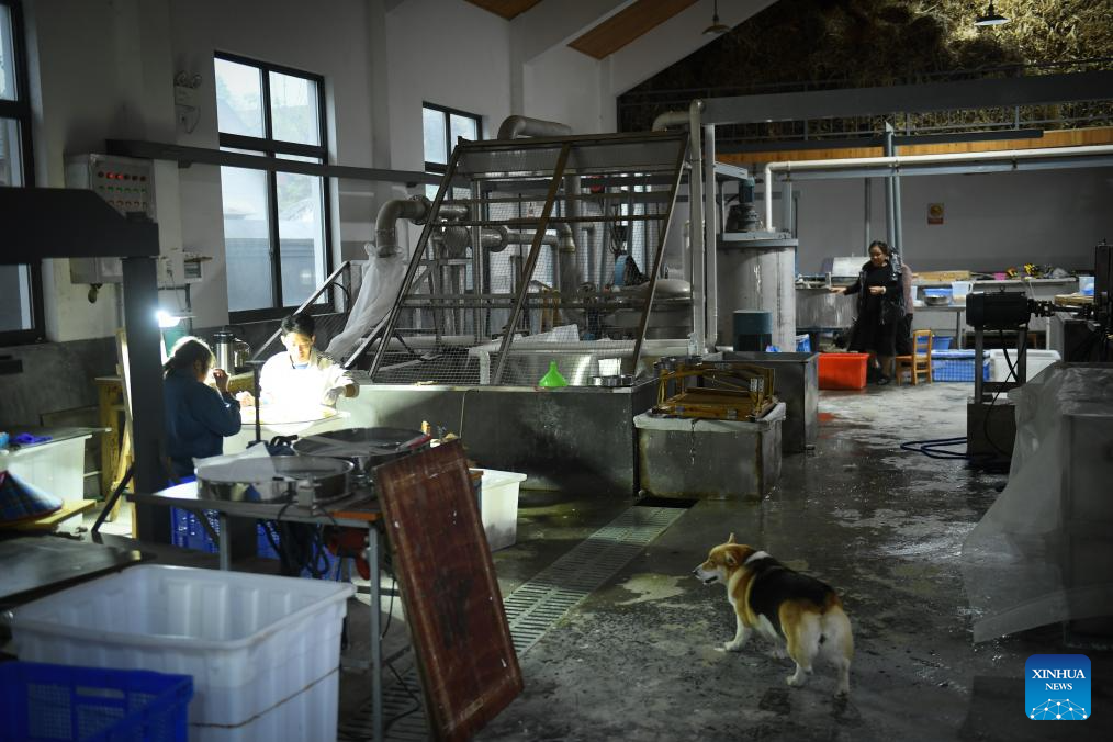 A worker removes impurities on paper at Huang Hongjian's studio in Kaihua County of Quzhou, east China's Zhejiang Province, Nov. 9, 2023. (Xinhua/Weng Xinyang)