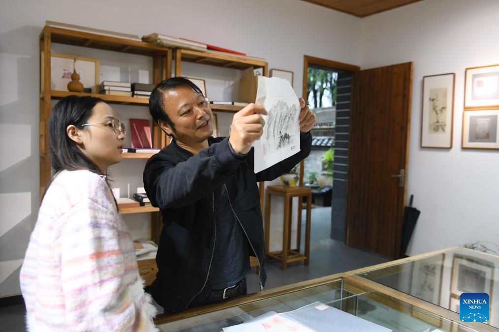 This photo taken on Nov. 9, 2023 shows ink and wash paintings done on modern Kaihua paper at Huang Hongjian's studio in Kaihua County of Quzhou, east China's Zhejiang Province. (Xinhua/Weng Xinyang)
