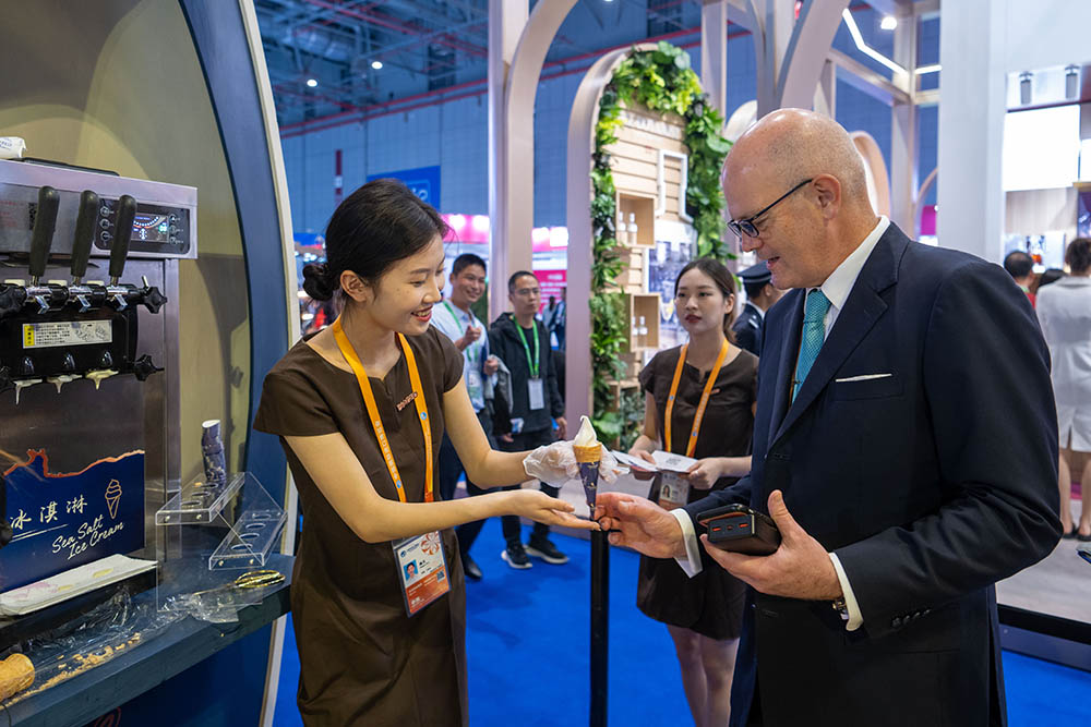 A staff member gives ice cream to a visitor at the booth of Diageo, a British spirits producer, in the food and agricultural products exhibition area of the sixth China International Import Expo (CIIE) in Shanghai. (People's Daily Online/Weng Qiyu)