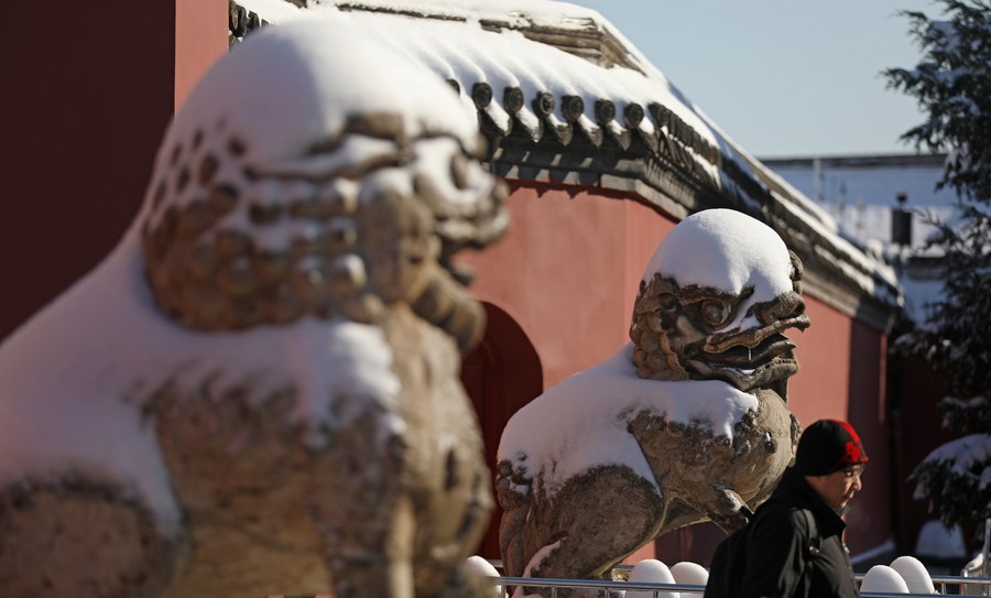 A tourist walks by a gate of the snow-covered Shenyang Imperial Palace in Shenyang, northeast China's Liaoning Province, Nov. 7, 2023. Shenyang Imperial Palace was built in 1625 and had been used as the imperial palace in early Qing Dynasty (1616-1911). (Xinhua/Yao Jianfeng)