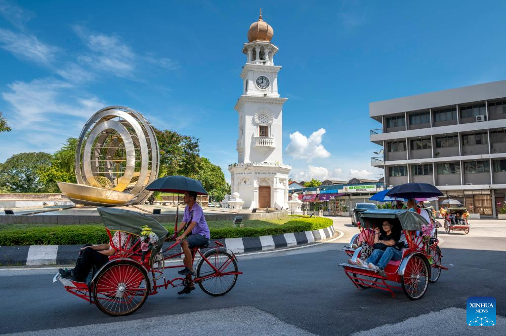 People go sightseeing on tricycles in Penang, Malaysia, Nov. 8, 2023. (Photo by Chong Voon Chung/Xinhua)
