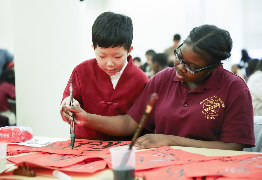 A student from Beijing teaches a student from Medgar Evers College Preparatory School of New York to practice Chinese calligraphy during a culture exchange event in New York, the United States, Feb. 2, 2018. (Xinhua/Wang Ying)