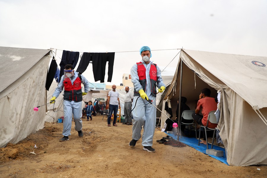 Staff workers disinfect temporary shelters in the southern Gaza Strip city of Khan Younis, on Nov. 12, 2023. (Photo by Rizek Abdeljawad/Xinhua)