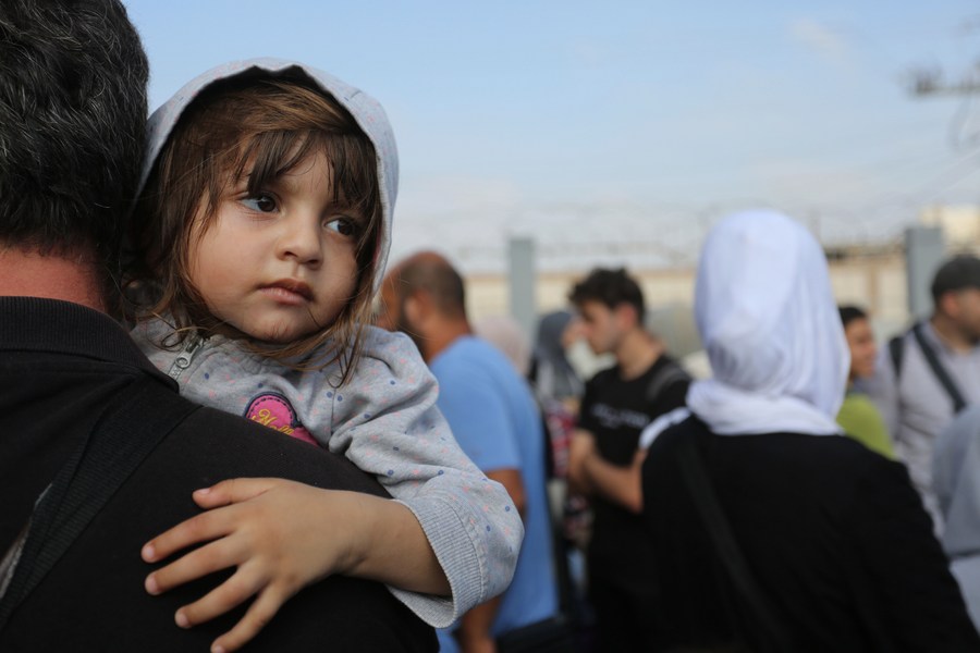 People wait to leave the Gaza Strip for Egypt via the Rafah crossing in the southern Gaza Strip, Nov. 8, 2023. (Photo by Khaled Omar/Xinhua)