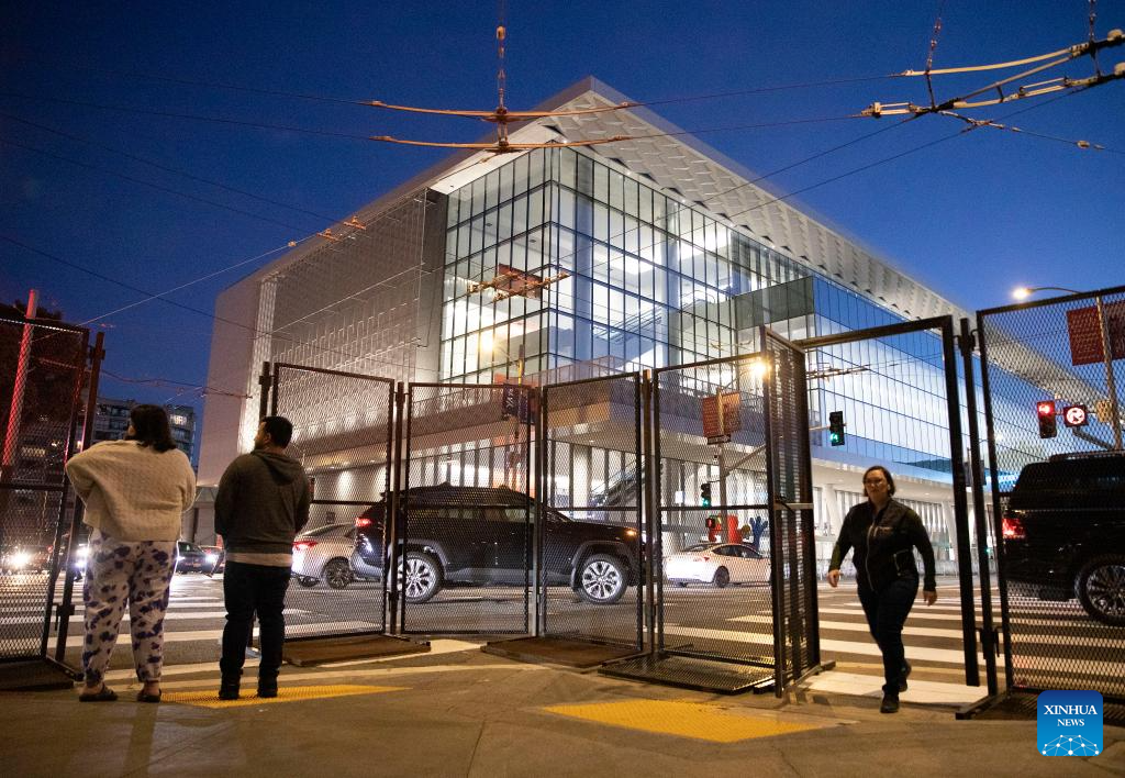 Workers set metal fences outside the venue of the 30th APEC Economic Leaders' Meeting in San Francisco, California, the United States, Nov. 10, 2023. The meeting is going to be held in San Francisco. (Photo by Li Jianguo/Xinhua)