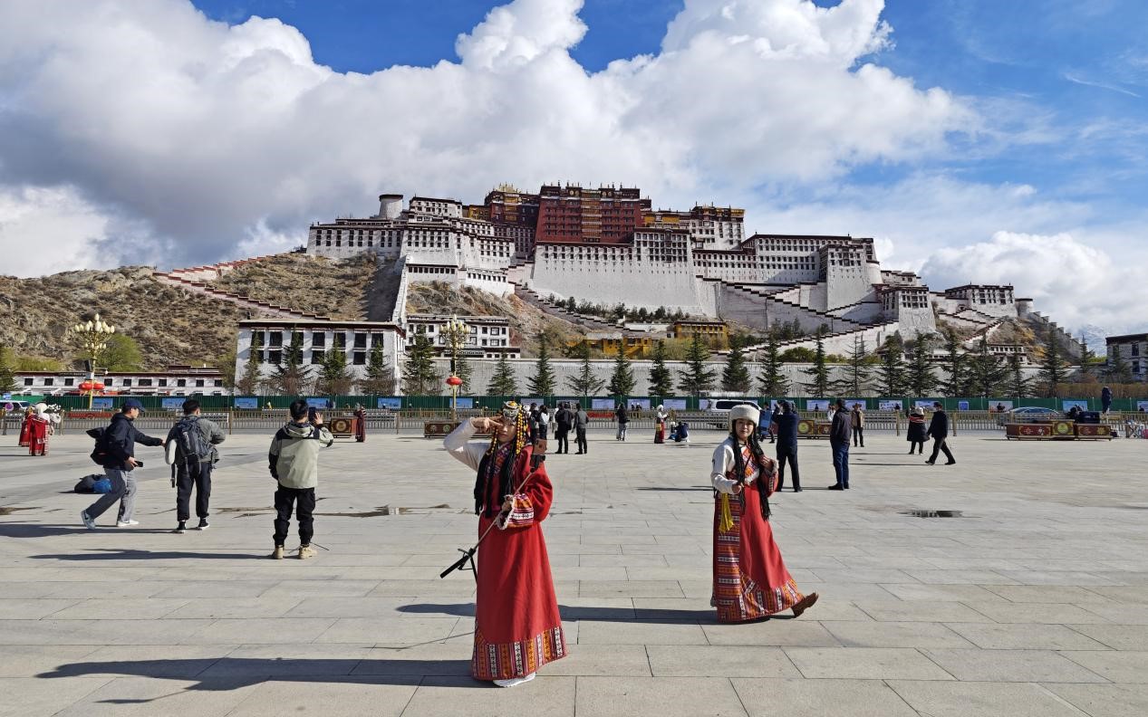 Tourists pose for pictures in front of the Potala Palace, Lhasa, southwest China's Xizang autonomous region, April 25, 2023. (People's Daily Online/Liu Debin)