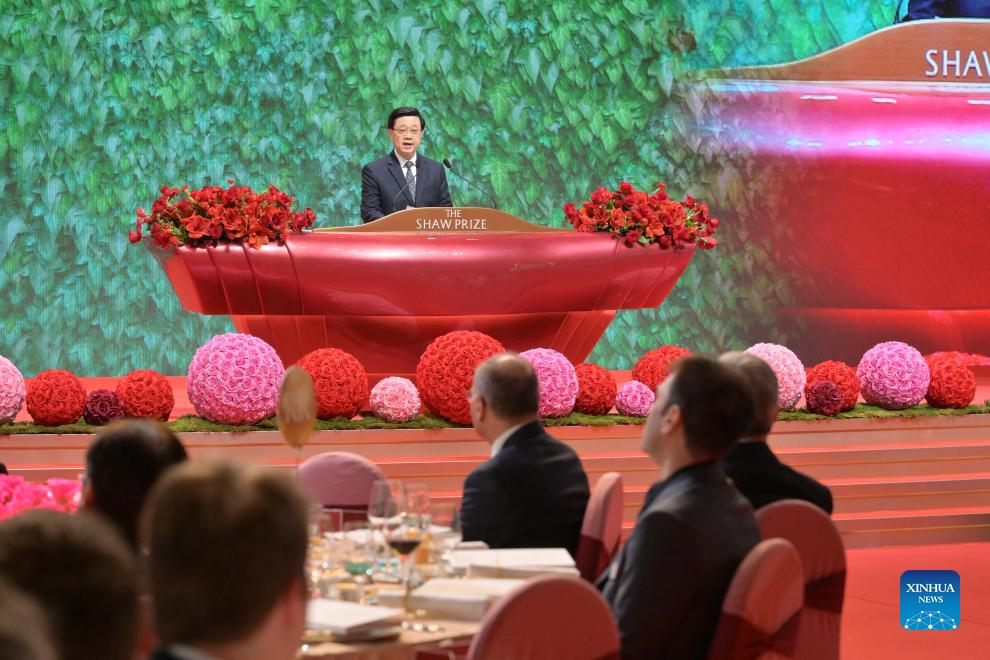 Chief Executive of the Hong Kong Special Administrative Region (HKSAR) John Lee speaks at the awarding ceremony of the Shaw Prize in Hong Kong, south China, Nov. 12, 2023. (Xinhua)
