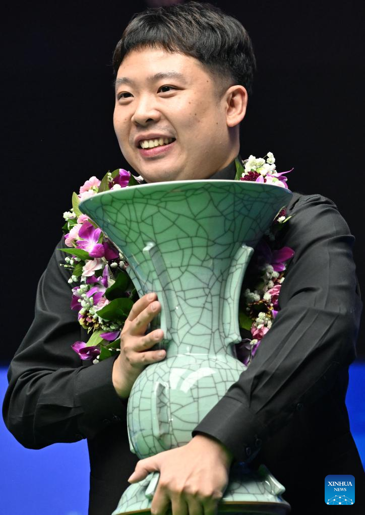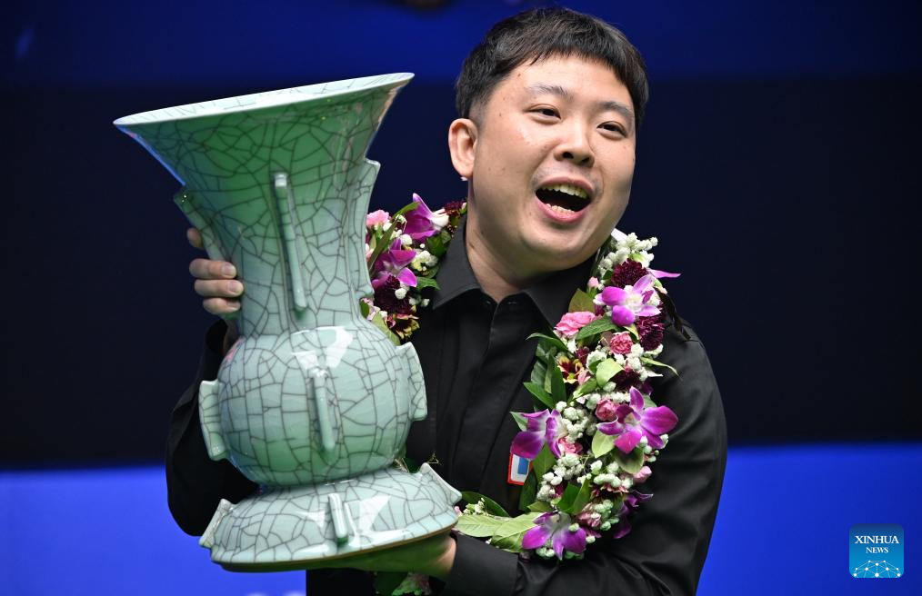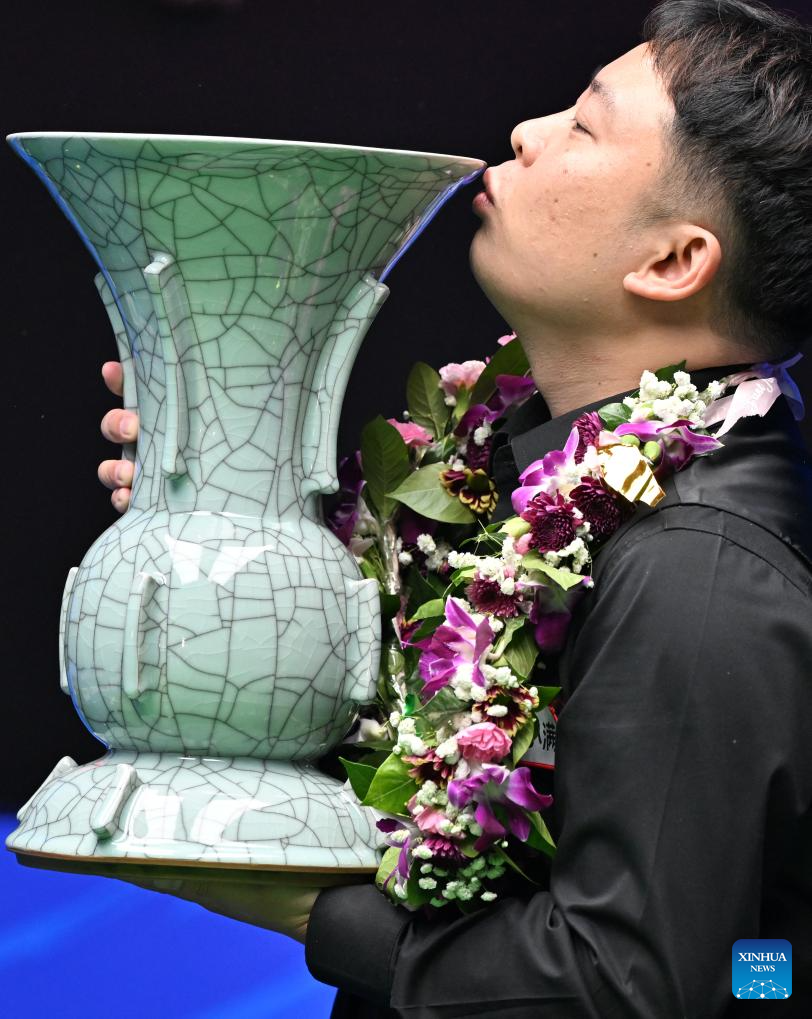 Zhang Anda celebrates with the trophy after the final between Zhang Anda of China and Tom Ford of England at World Snooker International Championship 2023 in north China's Tianjin Municipality, Nov. 12, 2023. (Xinhua/Li Ran)