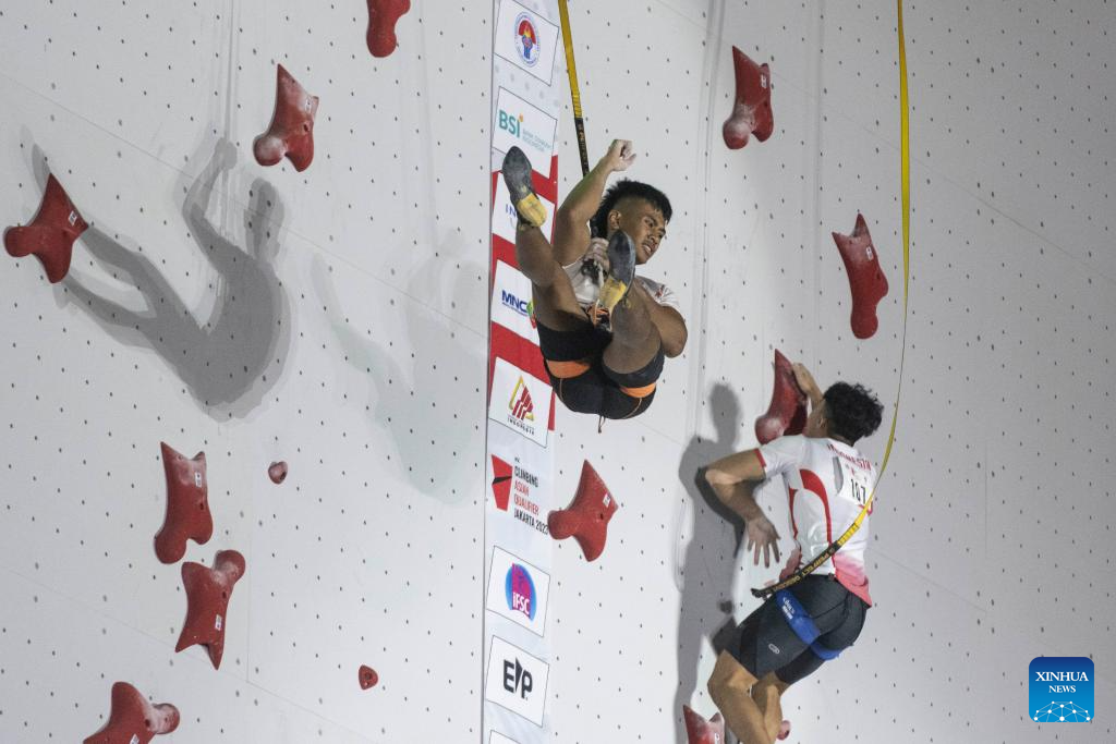 Rahmad Adi Mulyono of Indonesia competes during the Final of Men Speed of IFSC Asian Qualifier Jakarta 2023 in Jakarta, Indonesia, Nov. 12, 2023. (Xinhua/Xu Qin)