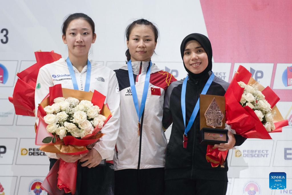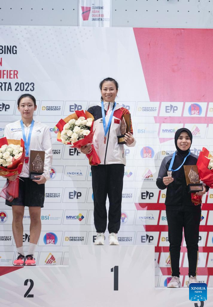 Deng Lijuan of China poses for photos during the awarding ceremony after the Final of Women Speed of IFSC Asian Qualifier Jakarta 2023 against Jeong Jimin of South Korea in Jakarta, Indonesia, Nov. 12, 2023. (Xinhua/Veri Sanovri)