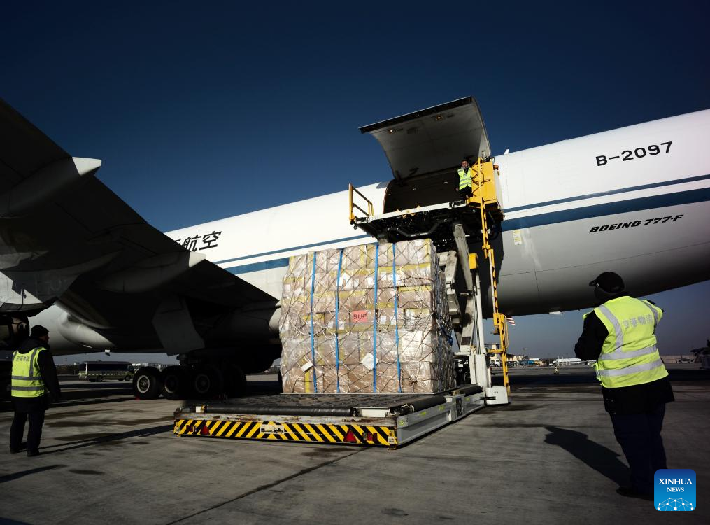 Staff members load cargo onto an aircraft at the Taoxian international airport in Shenyang, northeast China's Liaoning Province, Nov. 13, 2023. An e-commerce air cargo route linking Shenyang, capital of northeast China's Liaoning Province, and Chicago of the United States was opened Monday. (Xinhua/Li Gang)