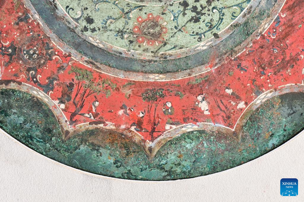 This photo taken on Aug. 25, 2023 shows part of a bronze mirror with colored patterns depicting an audience activity, collected at Xi'an Museum in Xi'an, northwest China's Shaanxi Province. (Xinhua/Li He)