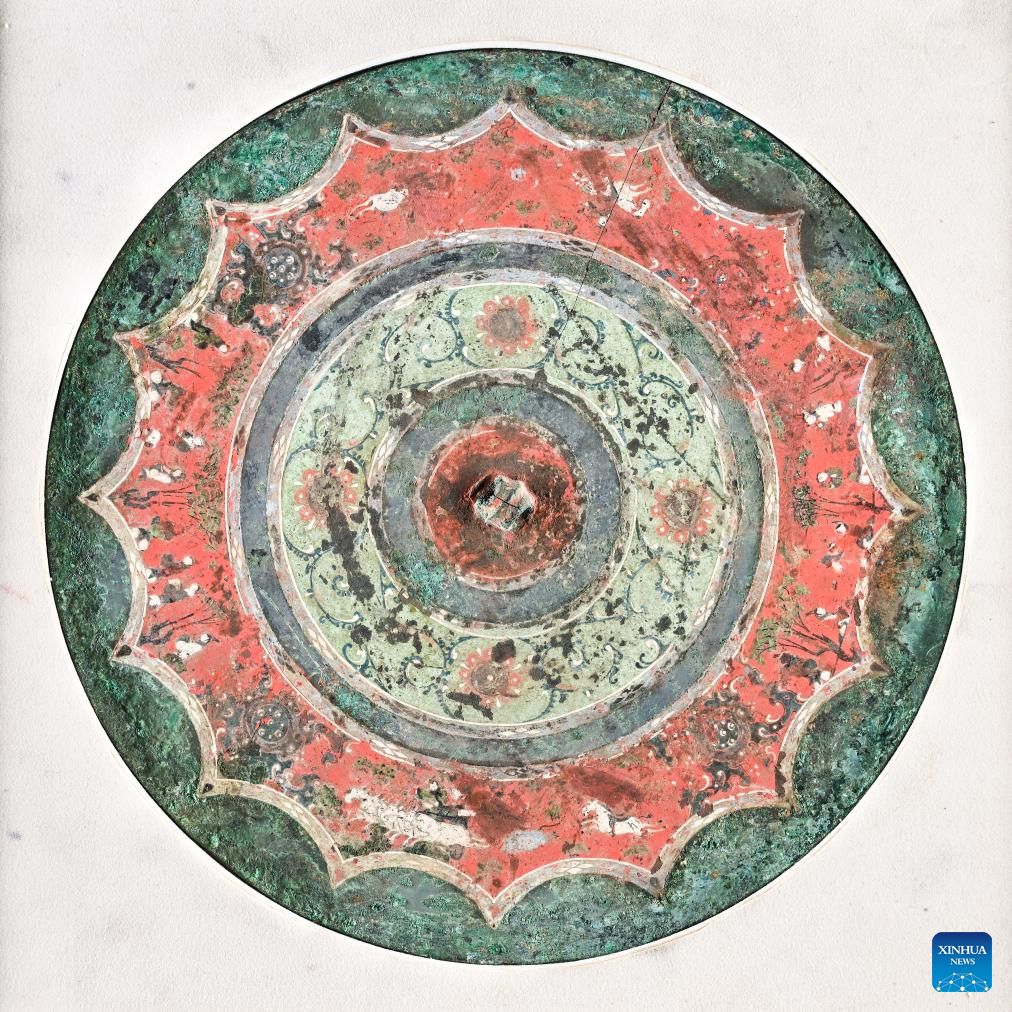 This photo taken on Aug. 25, 2023 shows part of a bronze mirror with colored patterns of figures, horses and carriages, collected at Xi'an Museum in Xi'an, northwest China's Shaanxi Province. (Xinhua/Wang Yuguo)