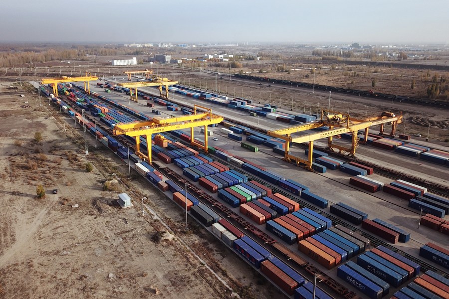 This aerial photo taken on Nov. 8, 2023 shows a view of the Horgos Railway Port in Horgos, northwest China's Xinjiang Uygur Autonomous Region. (Xinhua/Li Xin)