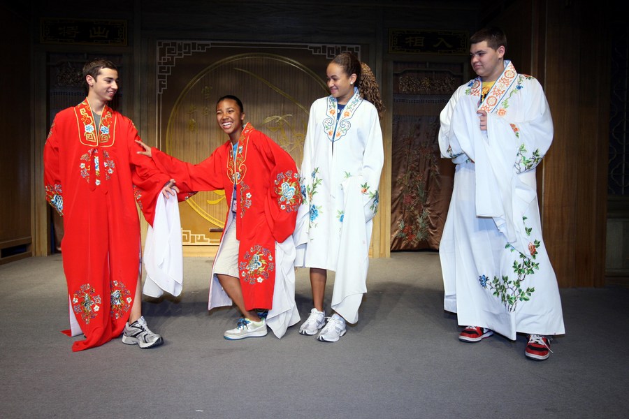 Some students from the U.S. pose on the stage of the Suzhou Kunqu Opera Museum in Suzhou City of east China's Jiangsu Province, June 18, 2009. (Xinhua/Zhang Jian)