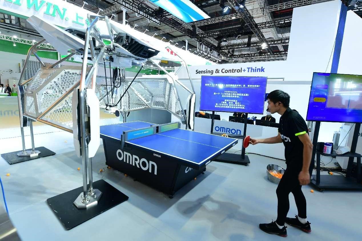 Table tennis coaching robot FORPHEUS is exhibited at the booth of Omron at the sixth China International Import Expo, Nov. 6. (People's Daily Online/Ji Haixin)
