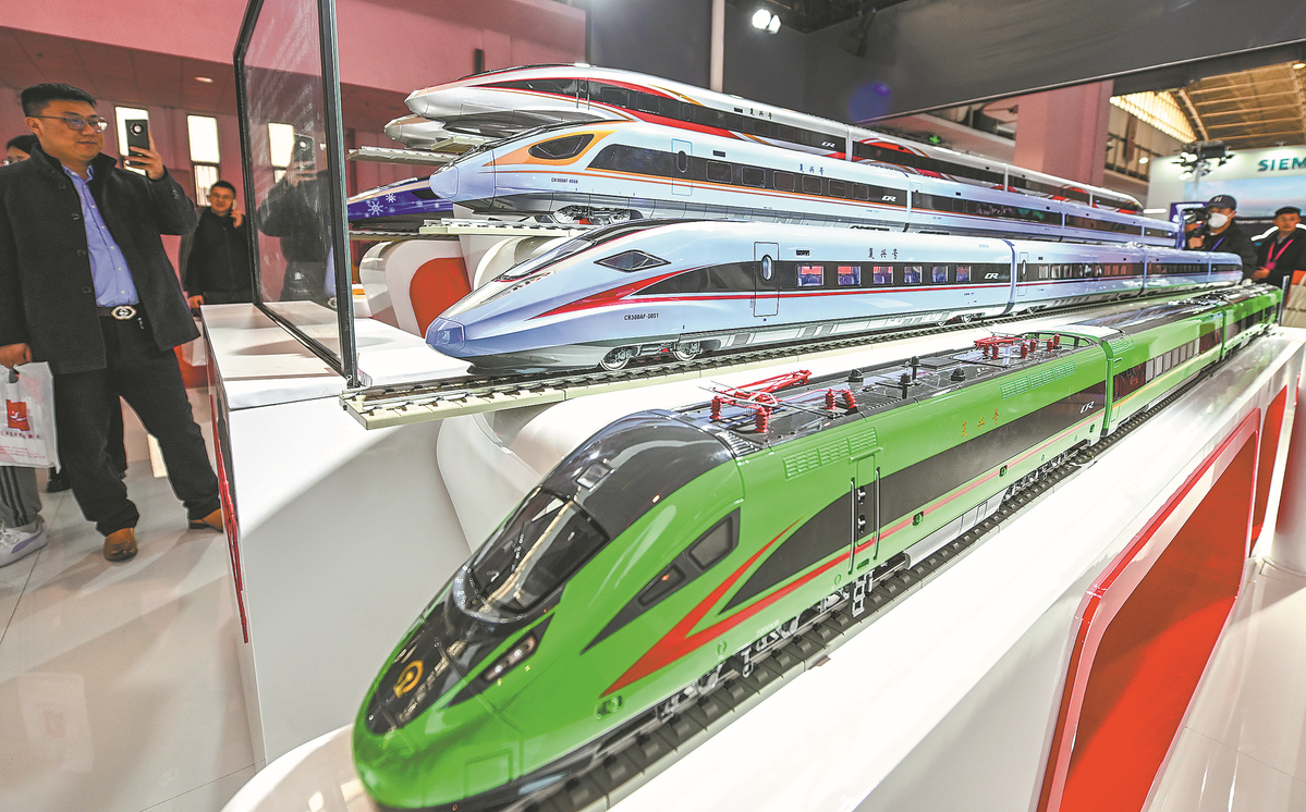Visitors examine models of the Fuxing series of high-speed trains at Modern Railways 2023, an exhibition of the latest railway technologies, in Beijing on Tuesday. The exhibition, participated in by some 400 enterprises from 14 countries and regions, featured forums on topics such as digitalization and logistics. BAO GANSHENG/FOR CHINA DAILY