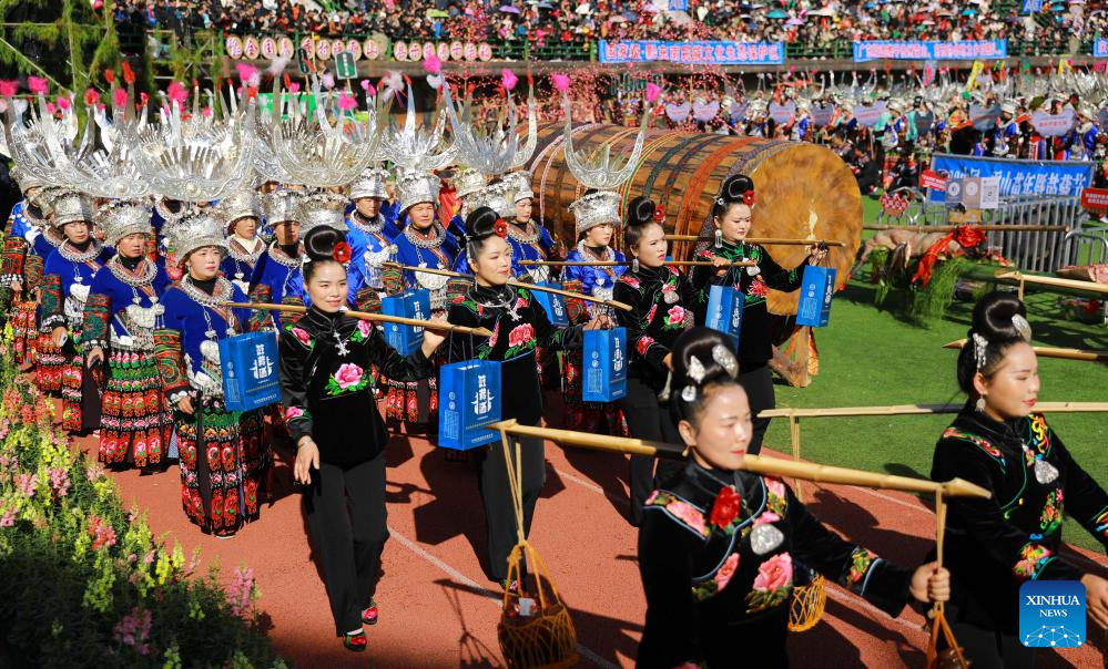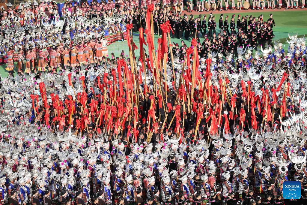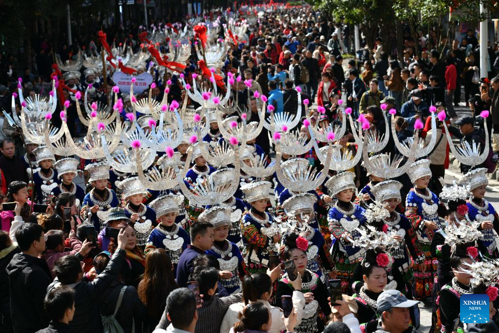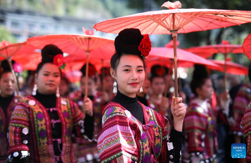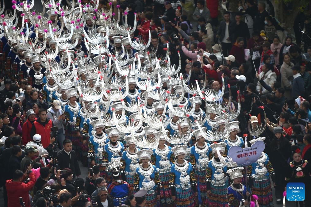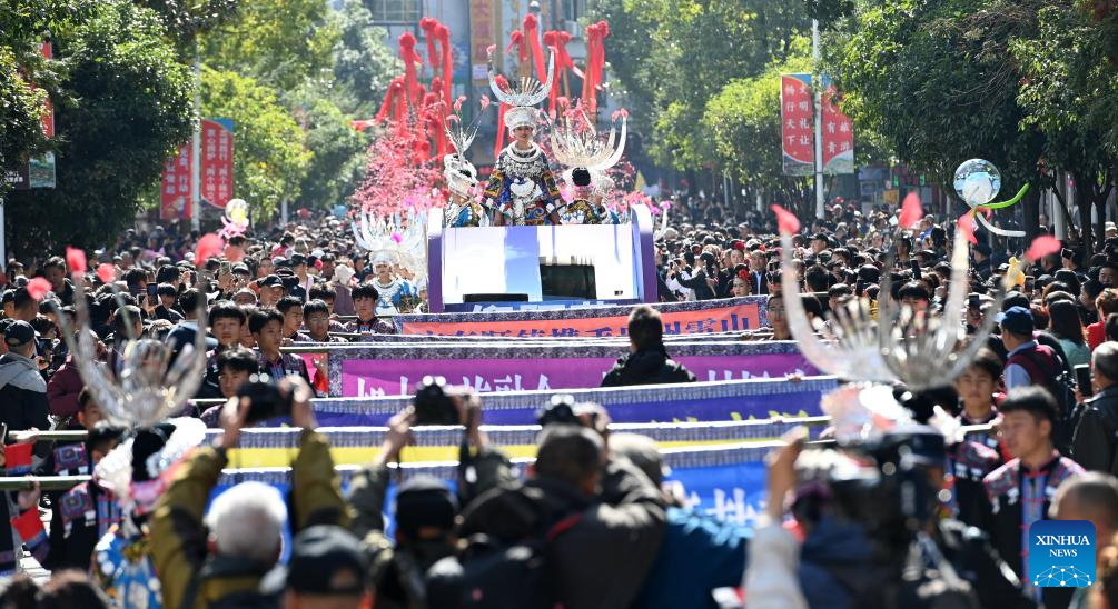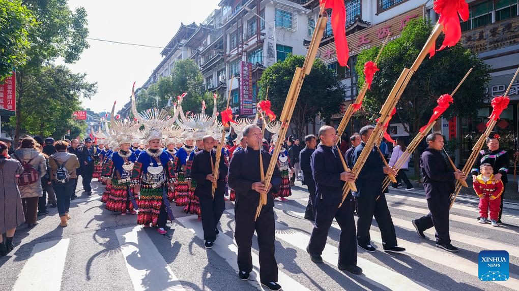 People of Miao ethnic group participate in a parade during celebrations of the Miao New Year and Guzang Festival in Leishan County of Qiandongnan Miao and Dong Autonomous Prefecture, southwest China's Guizhou Province, Nov. 16, 2023. Guzang Festival is the most important festival for the Miao people to offer sacrifice to their ancestors. This year's Guzang Festival and Miao New Year fall on the same day, which merits grander celebrations. (Xinhua/Yang Ying)
