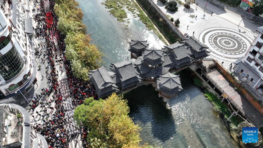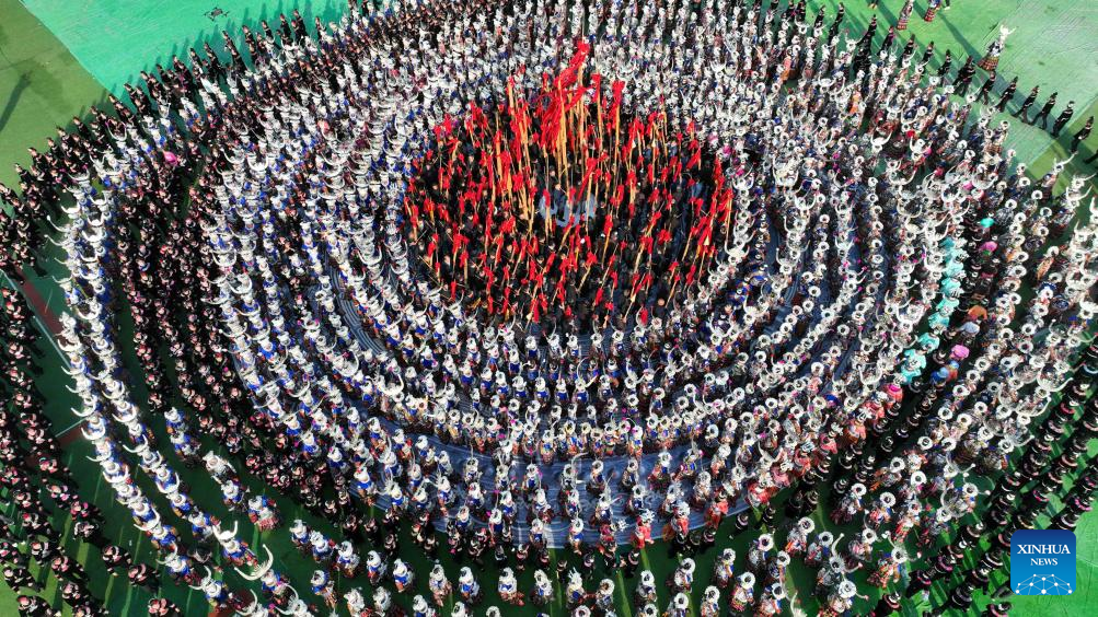 This aerial photo taken on Nov. 16, 2023 shows people of Miao ethnic group participating in a parade during celebrations of the Miao New Year and Guzang Festival in Leishan County of Qiandongnan Miao and Dong Autonomous Prefecture, southwest China's Guizhou Province. Guzang Festival is the most important festival for the Miao people to offer sacrifice to their ancestors. This year's Guzang Festival and Miao New Year fall on the same day, which merits grander celebrations. (Xinhua/Yang Ying)