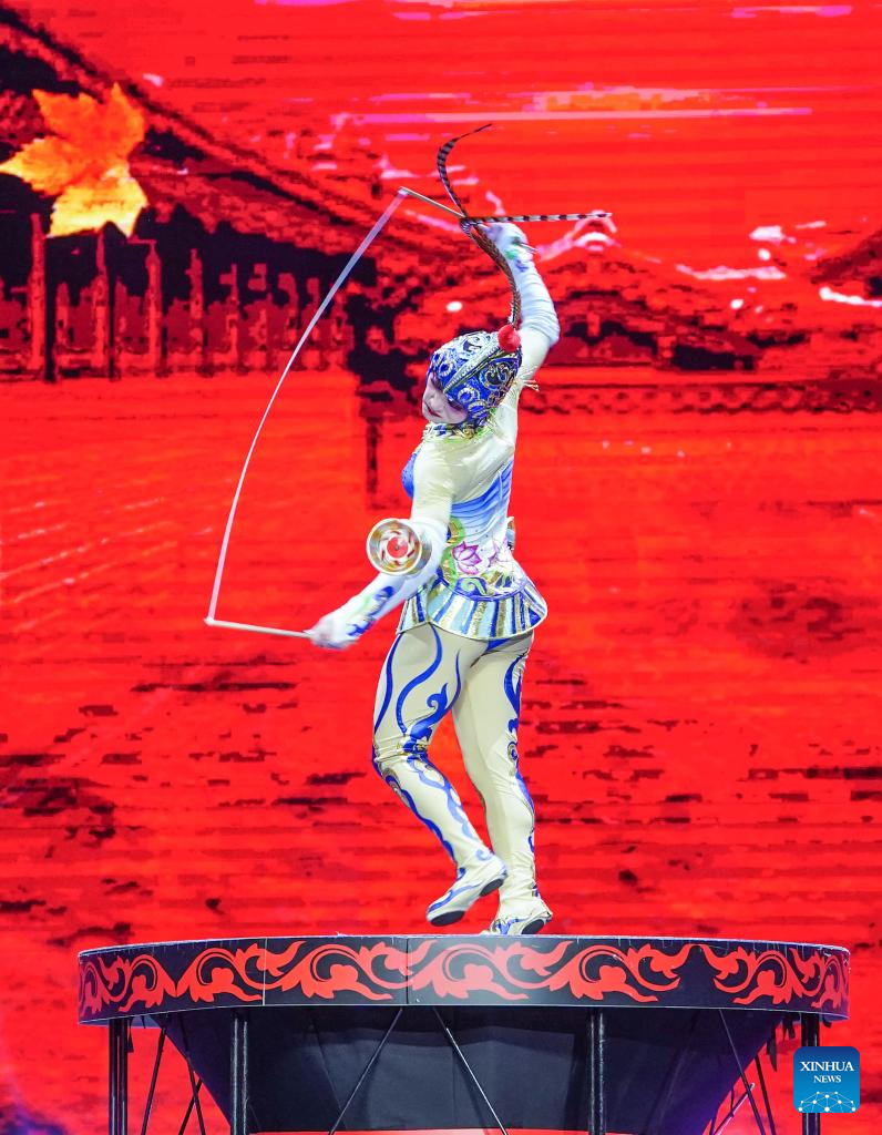 An actress performs during an acrobatic show in Beijing, capital of China, Nov. 17, 2023. A two-day acrobatic show kicked off in Beijing on Saturday. Eleven acrobatic art performing groups across the country bring 12 programs to the show. (Xinhua/Chen Yehua)